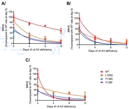 The modification of the vitamin K status in the mutated rat strains does not appear to have apparent clinical consequences when animals receive a diet supplemented with menadione. In fact, the rats do not show any changes in coagulation (the quick times are comparable between strains) and do not seem to have calcification problems (tissue calcium concentrations are also comparable between strains). On the other hand, it has been shown that rats homozygous for the Y139C mutation receiving a synthetic diet (cereals replaced by starch) not supplemented with menadione for three months presented very strong vascular calcifications in testes, lungs, and kidneys []. This is why we evaluated the ability of different rat strains to resist a limited vitamin K intake by feeding them a synthetic diet without menadione (diet-K3) for a period of 12 days. To evaluate their resistance, we determined tissue MK4 concentrations (except those in liver because of the extra low concentrations), plasma ucOC concentrations, and prothrombin time, throughout the period of limited intake of vitamin K. Menadione deficiency results very rapidly into lower tissue levels of MK4 in all tissues, regardless of strains. After only four days of menadione deficiency, tissue MK4 concentrations are no longer different between strains (except in testis of wild type rats). In the absence of menadione intake, synthesis of MK4 by the enzyme UBIA1 is stopped [,] and tissue MK4 levels decrease to reach the same concentration in all rats. The residual quantities are potentially synthesized by the intestinal microflora [], with the animals being all housed under the same breeding conditions, in the same rooms, and receiving all the same food. It was discovered that the presence of MK4 in the testis of wild type rats persisted longer. This persistence remains unexplained. The rapid decrease in testis of mutated strains might be due to the needs of vitamin K in other tissues to maintain the pool of activated VKDP.