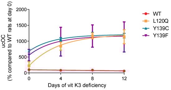 Consequences of the vitamin K3 deficiency were also assessed by determining the plasma ucOC concentration at day 0, 4, 8, and 12 after the beginning of the vitamin K3 deficiency. Results are presented in Figure 6. The ucOC concentration remained unchanged during the 12 days of vitamin K3 deficiency in wild type rats, while, in the other strains, ucOC concentration increased rapidly. ucOC concentration reached its maximum 4 days after the beginning of the vitamin K3 deficiency and increased two-fold in rats homozygous for Y139F and Y139C and four-fold in rats homozygous for L120Q.