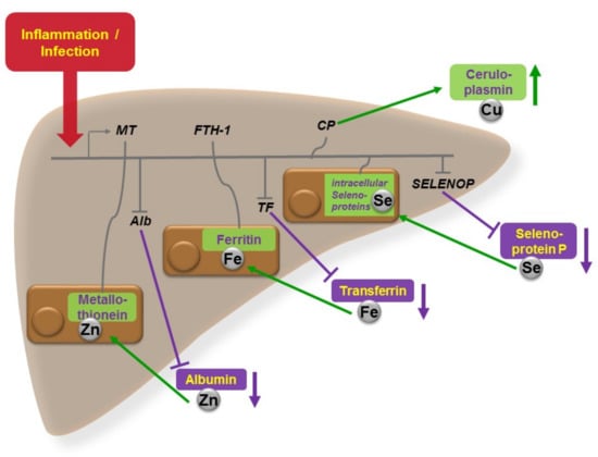 Central role of liver in acute phase regulation of circulating trace elements. In response to infection or inflammation, and the associated increase in pro-inflammatory cytokines, hepatocytes modify trace element metabolism, in order to deprive invading pathogens from supply with essential growth factors, and at the same time, improving the host’s anti-inflammatory response. The figure depicts schematically the effects on the distribution of copper (Cu), iron (Fe), selenium (Se), and zinc (Zn) between blood and liver. Serum Cu levels increase in response to inflammation mainly via up-regulated ceruloplasmin (CP) biosynthesis and secretion into blood. The hepatic hormone hepcidin diminishes Fe supply to the circulation and at the same time, transferrin concentrations decline, while intrahepatic ferritin (FTH-1) increases, collectively reducing circulating Fe levels (anaemia of inflammation). Hepatic selenoprotein biosynthesis becomes redirected in favor of certain intracellular selenoproteins and at the expense of the circulating Se-transport protein selenoprotein P (SELENOP). The re-distribution of Zn is more complex, involving all major organs, including immune cells and the gastrointestinal system, and a large number of Zn-dependent proteins [1]. A significant flow of Zn levels takes place from circulating albumin into hepatocytes and toward intracellular metallothioneins (MT).
