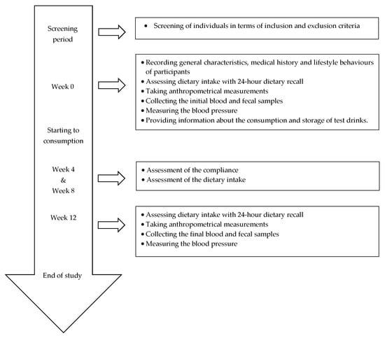 A parallel-group, randomized, controlled clinical trial was performed. A total of 40 eligible participants were randomized, and 20 participants in each group were allocated to intervention. Five participants in the kefir group and four participants in the unfermented milk group did not receive the allocated intervention due to medical conditions and not providing the fecal samples, and also three participants in the kefir group and six participants in the unfermented milk group discontinued the intervention due to taking antibiotics and declined consent. Therefore, the study was completed with 22 participants and an allocation ratio of 55%. The recruitment and follow up of participants were conducted between March 2015–July 2017. Participants were randomized into two groups (kefir group and unfermented milk group as control) by the research physicians using a stratified block randomization method. The random allocation sequence was provided by the Department of Biostatistics, Hacettepe University. Participants visited the research center 5 times in total. The first visit included the screening of individuals in terms of inclusion and exclusion criteria. The second visit (Week 0) included recording general characteristics, medical history, and lifestyle behaviors of participants, assessing the nutritional status of participants using 24-h dietary recall and anthropometrical measurements, collecting the initial blood and fecal samples, measuring the blood pressure, and also proving information about the consumption and storage of test drinks. The third (Week 4) and forth (Week 8) visits included the assessment of the compliance in terms of consumption of test drinks and dietary intake. The fifth visit (Week 12) included the assessment of the nutritional status of participants using 24-h dietary recall and anthropometrical measurements, collection of the final blood and fecal samples, and the measurement of blood pressure (Figure 1).
