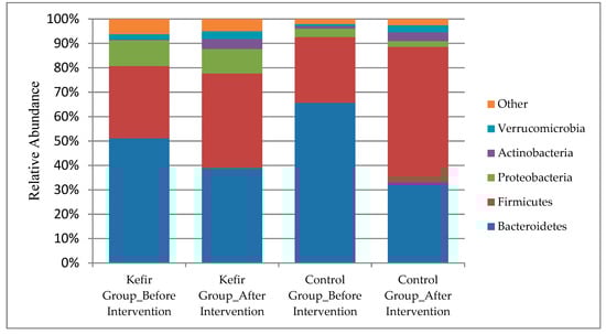 In regard to the analysis of gut microbiota composition, the mean number of total reads per sample was 90627 (Standart Deviation (SD): 44912; range: 31198–183068) at baseline and 118025 (SD:38831; range 39248–171915) after the intervention in kefir group, while it was recorded as 138775 (SD: 29961, range: 100922–195456) at the baseline and 95058 (SD: 23740, range: 55853–124889) after the intervention in the unfermented milk group. The gut microbiome of the participants was composed of phyla Bacteroidetes (51%), Firmicutes (30%), Proteobacteria (11%), Verrucomicrobia (0.02%) and Actinobacteria (0.003%) at the baseline in kefir group; the relative abundance of these phyla were detected as 39%, 39%, 10%, 0.03%, and 0.04% respectively after the intervention of kefir. Only the increase in the relative abundance of Actinobacteria was found to be statistically significant (p = 0.023). In the unfermented milk group, the phyla Bacteroidetes (66%), Firmicutes (27%), Verrucomicrobia (0.01%), Actinobacteria (0.01%), and Proteobacteria (0.03%) were detected at the baseline, however, the relative abundance of these phyla were changed to 33%, 56%, 0.03%, 0.04%, and 0.02% respectively after the intervention (Figure 2). When the changes in the relative abundance of each phyla distribution from after the intervention to baseline were compared between the groups, no significant difference was obtained (p > 0.05, for each). In the kefir group, the median of Firmicutes/Bacteroidetes ratio was 0.62 (range:0.06–10.01) at the baseline, and 1.77 (range:0.14–46.16) after the intervention (p = 0.388). This ratio was 0.30 (range:0.03–25.27) and 2.22 (range:0.34–12.04) respectively at baseline and end of the intervention in the unfermented milk group (p = 0.333). No significant difference was obtained between the changes in Firmicutes to Bacteroidetes ratio of groups (p > 0.05).