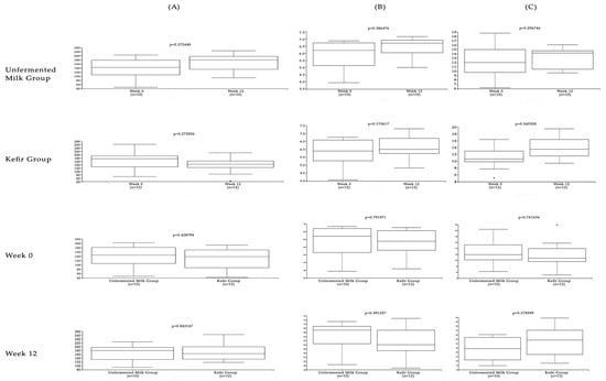 In this parallel–group randomized controlled study, regular kefir consumption during 12 weeks provided some improvements in anthropometrical measurements, lipid profile, glycaemic status, and inflammation in participants with MetS. In particular, insulin and HOMA–IR levels were significantly decreased, and also pro–inflammatory cytokines (TNF–α and IFN–γ) and blood pressure were ameliorated by kefir consumption. However, the magnitude of the improvements stayed insignificant when compared to unfermented milk. The effects of kefir on metabolic status were previously investigated in both animal models and human studies [37,38,39]. Some animal models suggested that kefir might have a potential to benefit the management of MetS by reducing body weight, fasting blood glucose, insulin, total, and LDL cholesterol, triacylglycerol, and pro–inflammatory cytokines, including IL–1β and IL–6 [38]. However, the evidence from human studies has been controversial. For instance, Ostadrahimi et al. reported that consumption of 600 mL/d kefir containing Lactobacillus casei, Lactobacillus acidophilus, and Bifidobacteria species had beneficial effects on fasting blood glucose and HbA1c compared to the control drink in patients with type 2 diabetes [37]. On the other hand, St–Onge et al. showed that 500 mL/day of kefir consumption for four weeks had no effect on lipid profile [40]. Furthermore, Fathi et al. showed that two servings of kefir in a day during eight weeks led a similar improvement both in lipid profile and weight management compared with milk [41,42]. The variation in response to the kefir consumption could be mainly explained by the variation of kefir composition, and the characteristics of study samples in different studies. Many different bacteria and yeast might be used for kefir production, and this might lead to distinct effects on metabolism and gut microbiota. Kefir used in this study contained Lactococcus lactis subsp. lactis, Lactococcus lactis subsp. cremoris, Lactococcus lactis subsp. diacetylactis, Leuconostoc mesenteroides subsp. cremoris, Lactobacillus kefir, Kluyveromyces marxianus, and Saccharomyces unisporus, and differed from the kefir samples used in other studies [37,38]. Furthermore, the initial metabolic profile of the participants was suggested an essential factor for the efficacy of probiotic interventions. Fuentes et al. showed that probiotics are more effective in patients with high baseline total cholesterol levels (251–300 mg/dL) compared to the patients with low baseline total cholesterol levels (200–250 mg/dL) [43]. Similarly, Nikbakht found out that probiotic supplementation was only effective in patients with baseline fasting blood glucose level above 126 mg/dL [44]. In our study, the median of total cholesterol levels was 243.50 mg/dL and 220.00 mg/dL, and the baseline glucose levels were 105.00 mg/dL and 101.50 mg/dL for kefir group and unfermented milk group, respectively. This may partly explain the lack of efficacy of kefir on metabolic status in our study.
