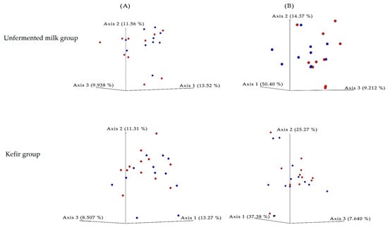 Principal coordinate analysis (PCoA) plot of the unweighted (A) and weighted (B) UniFrac distance matrices in the study groups. The plots were generated using EMPeror [36]. Axis titles indicate the percentage variations. The colors indicate sampling time (red: week 0, blue: week 12).