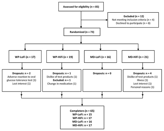 Participant flow diagram. HiFi, high fiber; LoFi, low fiber; MD, maltodextrin, WP, whey protein.