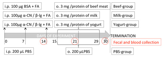Mice were allocated to four groups: Milk, Yogurt, Beef, and control PBS, (n = 10 mice/group; Figure 1). Mice in the Beef group were sensitized with BSA (100 μg/mouse; Sigma-Aldrich) dissolved in PBS. Mice in the Milk and Yogurt groups were sensitized thrice at weekly intervals by intraperitoneal (i.p.) injection of a mixture of α-CN and β-lg in PBS in the presence of Freund’s adjuvant (100 μg of proteins/mouse, at a 4:1 ratio; Sigma-Aldrich, Poznan, Poland). Mice in the Beef, Milk, and Yogurt groups were administered 3 mg beef, milk, or yogurt, respectively, for 14 consecutive days using a pipette. Mice in the PBS control group were administered PBS following the same schedule. On days 15, 22, and 29 of the experiment, the mice from Milk, Yogurt, and Beef groups were given 10 μg cholera toxin as a mucosal adjuvant, together with supplemented food. Blood and fecal samples were collected every week, starting from the 14th day of the experiment. Coagulated blood was centrifuged in a 5418R centrifuge (Eppendorf, Hamburg, Germany) at 16,900× g for 10 min. Fecal pellets were extracted with PBS containing 0.01% NaN3 at 4 °C for 20 min and centrifuged as described above [23]. The fecal extracts and serum samples were stored at −20 °C until analysis.