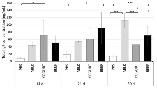 Total serum IgE levels in mice on days 14, 21, and 30 of the experiment. Mice were divided into four treatment groups (n = 10): Mice in the Milk and Yogurt groups were immunized with α-CN/β-lg and fed milk or yogurt, respectively. Mice in the Beef group were immunized with BSA and fed beef meat. Mice in the PBS group were administered PBS. Data are the mean ± SD. * p < 0.05, *** p < 0.001, one-way ANOVA with Tukey post-hoc tests.