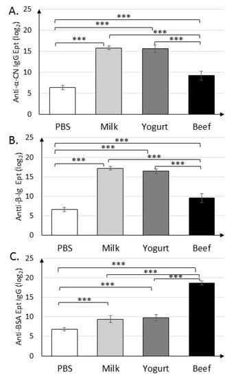 Immunization with α-CN/β-lg and feeding mice with milk or yogurt resulted in similar titers of anti-α-CN IgG (215.8±0.45, 215.6±0.89) and anti-β-lg IgG (217.2±0.45, 216.4±0.55) (Figure 3A,B). Mice in the Beef group exhibited similar titers of anti-β-lg and anti-α-CN IgG, which were nearly two times lower than those in the Milk and Yogurt groups (p < 0.001). Titer of the anti-BSA IgG (Figure 3C) in the Milk and Yogurt groups were 29.4±0.89 and 29.8±0.83, respectively, and were significantly lower from those in the PBS. Its titers were almost two times lower then specific IgG Ept in Beef group (p < 0.001).