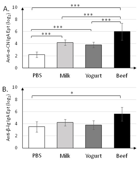 Specific secretory IgA was determined in fecal samples collected on the final day (30 d) of the experiment (Figure 4). sIgA titers (~26) in the Beef group were the highest (p < 0.001) for all antigens tested (Figure 4A–C). sIgA titers in the Milk and Yogurt groups were similar for all antigens tested, and were significantly different from those in the PBS group for anti-α-CN (24.2±0.45 and 23.8±0.45 vs. 22.2±0.45; p < 0.001).