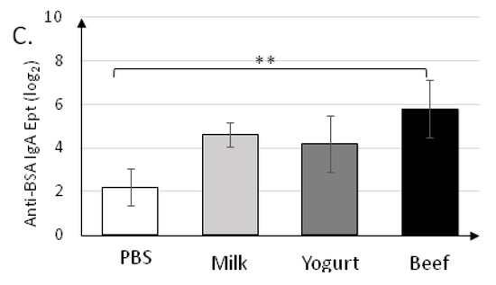 IgA produced in the mucous membrane is important for immune response [31]. Frossard et al. [32] reported that the level of secretory IgA was higher in tolerant mice and lower in allergic mice when IgE was used as a marker of food allergy. Interestingly, as for the fecal sIgA titer, mice fed beef homogenate had the highest levels of IgA against all antigens tested, and the levels were different from those in the PBS group (p < 0.05). This suggests that beef homogenate exerts a protective role in the intestinal mucosa. Anti-α-CN sIgA titers were significantly different between the Yogurt and Beef groups (p < 0.001; Figure 4). This fact presents α-CN as the strongest allergen from the three tested in this study. The BSA-treated group had almost 50% higher specific sIgA when compared to the Milk or Yogurt groups. This suggests that controlled diet supplementation with BSA could modulate immune system response to milk allergens. This hypothesis needs future study.