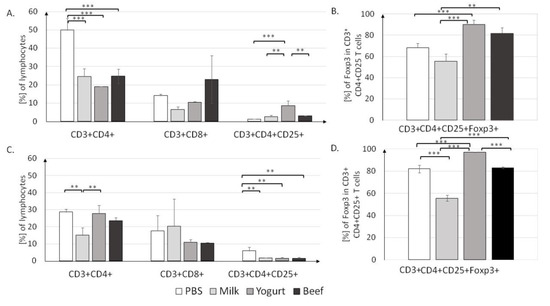 T cell profiles in the MLN (A,B) and PP (C,D) in mice from the PBS, Milk, Yogurt, and Beef groups. Cells were gated as follows: FSC/SSC lymphocytes were gated. Then, CD3+ and CD4+ or CD8+ cells were gated. From CD4+CD25+, FoxP3+ cells were gated. For each sample, 50,000 events were collected. Data are the mean ± SD. ** p < 0.01, *** p < 0.001, one-way ANOVA with Tukey post-hoc tests.