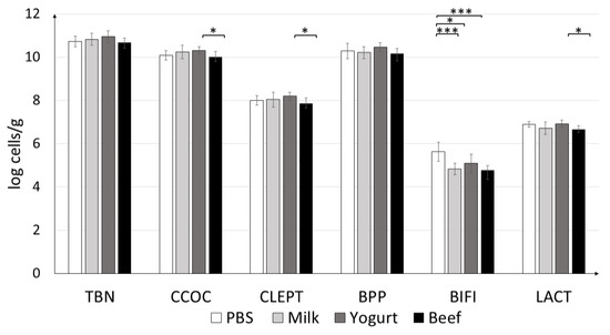 Quantification of the colonic microbiota revealed that the mice fed yogurt had higher levels of C. coccoides and C. leptum, and Lactobacillus (Figure 8). Statistically significant differences were observed between the groups fed yogurt and beef. The amount of Bifidobacterium differed significantly between the PBS and Yogurt (p < 0.05), Beef, and Milk (p < 0.001) groups. The highest amounts of all tested strains (except Bifidobacterium) were found in the Yogurt group.