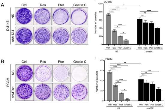 Approximately 2 × 103 parental non-silenced (NS) and MTA1 knockdown DU145 and PC3M cells were seeded in 35-mm culture dishes for the 2-week observation time, as described recently [11,33]. Cells were treated with vehicle, Res, Pter, or Gnetin C every other day. Upon the formation of colonies, cells were fixed and stained with 0.01% crystal violet solution. Images of colonies were captured using an Amersham Imager 600 and analyzed using ImageQuant TL software (GE Healthcare Bio-Sciences, Pittsburg, PA, USA).