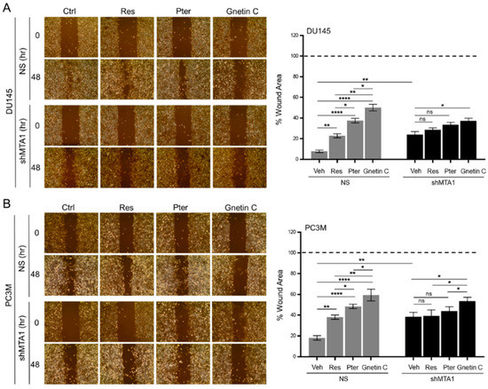 Gnetin C reduces the MTA1-mediated motility of PCa cells more potently than resveratrol and pterostilbene. (A,B) Representative images showing the migration ability of DU145 and PC3M MTA1 expressing (NS) and MTA1 knockdown (shMTA1) cells after treatment with 1 μM of Res, Pter, and Gnetin C for 48 h. Right, Quantifications of wound widths as a percentage of wound area using ImageJ software is shown for each cell line. Data represent the mean ± SEM of six separate wounds and three independent experiments. * p < 0.05; ** p < 0.01; *** p < 0.001; **** p < 0.0001 (one-way ANOVA).