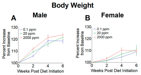 Relative body weights of mice upon initiation of 0.1, 20, and 2000 ppm Mn diets. (A) Male mice. (B) Female mice. Body weights expressed as percent increase from baseline during 6-week diet period (n = 6/sex). Data expressed as mean ± SEM.