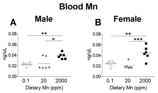 Whole blood Mn levels in mice on 0.1, 20, and 2000 ppm Mn diets. Mn content measured by inductively coupled plasma mass spectrometry (ICP-MS) in (A) male and (B) female mice at 12 weeks of age (n = 6/sex). Data expressed as mean ± SEM. * p < 0.05, ** p < 0.01, *** p < 0.001.