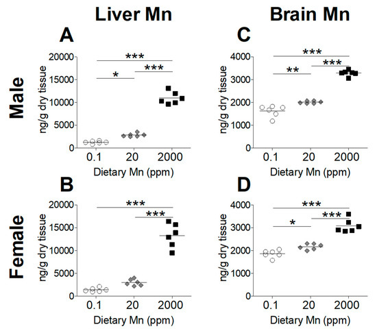 Tissue Mn levels in mice on 0.1, 20, and 2000 ppm Mn diets. Mn content measured by ICP-MS in male and female mice at 12 weeks of age (n = 6/sex). (A and B) Liver. (C and D) Brain. Data expressed as mean ± SEM. * p < 0.05, ** p < 0.01, *** p < 0.001.