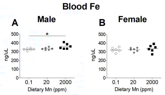 Divalent metal transporter 1 (DMT1) is considered the primary transporter for Fe2+ absorption [24]. Competitive inhibition studies in K562 erythroleukemia cells show that Mn2+ and Fe2+ share the DMT1 pathway for cellular uptake and high concentrations of Mn reduces uptake of Fe2+ [24]. To determine if a high-Mn diet reduces body Fe levels and whether a low-Mn diet also influences Fe status, we measured Fe levels in the blood and other tissues. While varying Mn intake produced marked changes in Mn status, Fe status was only minimally affected. Blood levels of Fe were slightly increased in males on the 2000 ppm Mn diet, but only when compared to males on the 0.1 ppm Mn diet, with females having no statistically significant differences between the three groups (Figure 4). In the body, the liver and spleen are primary storage sites for Fe, and stored Fe becomes depleted before levels of circulating Fe decrease [25]. A moderate reduction in hepatic Fe was seen in males on the 2000 ppm Mn diet, while females did not show any statistically significant differences (Figure 5A,B). In the spleen, Fe levels were modestly reduced in males on the 2000 ppm Mn diet (−26%) and substantially reduced in females on the same diet (−37%) compared to those on the control diet (Figure 5C,D). No significant differences in Fe were observed in the brain (Figure 5E,F). The observed reductions of Fe in the liver and spleen of mice on the high-Mn diet suggest a release of storage Fe into the circulation, which may explain the lack of effect on blood Fe and the slight increase in males on the high-Mn diet compared to those on the low-Mn diet.