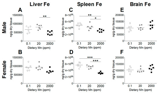 Tissue Fe levels in mice on 0.1, 20, and 2000 ppm Mn diets. Fe content measured by ICP-MS in male and female mice at 12 weeks of age (n = 6/sex). (A and B) Liver. (C and D) Spleen. (E and F) Brain. Data expressed as mean ± SEM. * p < 0.05, ** p < 0.01, *** p < 0.001.