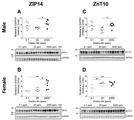 Comparison of transporter protein levels in the liver. Expression of (A and B) ZIP14 and (C and D) ZnT10 in male and female mice on 0.1, 20, and 2000 ppm Mn diets (n = 6/sex). Liver samples were obtained at 12 weeks of age and analyzed via western blot. Quantifications of protein levels were performed using GAPDH as a loading control. ZIP14 blots also include results from an age-matched Zip14 knockout (KO) mouse as a control (fed traditional rodent diet). Data expressed as mean ± SEM. * p < 0.05, ** p < 0.01.
