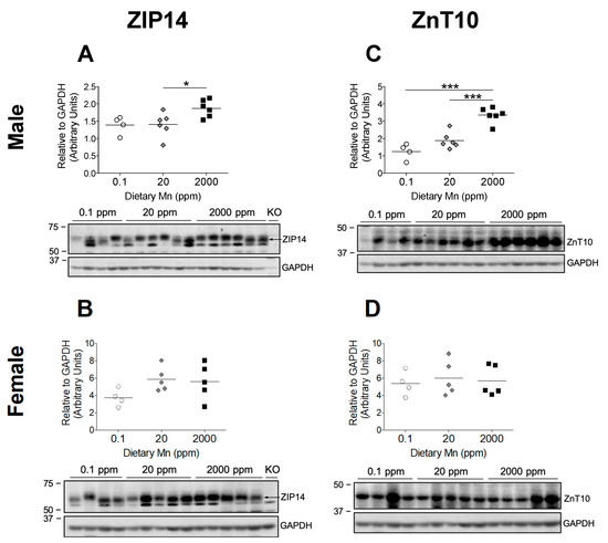 The significant increase in body Mn levels observed in the 2000 ppm Mn diet groups indicate that these mice were in a state of Mn overload, while the 0.1 ppm Mn diet groups displayed only slightly reduced body Mn (Figure 2 and Figure 3). Based on phenotypes of individuals with ZIP14 and ZnT10 mutations, it is clear that these transporters are required to maintain Mn homeostasis [13,14]. However, it is not known how these two transporters are regulated by Mn. Both ZIP14 and ZnT10 are highly expressed in the liver, which is a major organ involved in regulating Mn metabolism [12,15]. ZIP14 mainly localizes at the basolateral membrane of hepatocytes, while ZnT10 localizes to the canalicular domain of hepatocytes [26,27]. These two transporters work together to regulate hepatobiliary Mn excretion [27]. We aimed to establish whether a high-Mn diet would increase levels of ZIP14 and ZnT10 in the liver, and determine if they would similarly be downregulated by a low-Mn diet. We found that in both male and female mice, hepatic ZIP14 was significantly upregulated in the 2000 ppm Mn diet group compared to controls (20 ppm Mn) (Figure 6A,B). While males on the 0.1 ppm Mn diet showed varied hepatic ZIP14 levels, females on the 0.1 ppm Mn diet had more uniform ZIP14 levels, though neither were statistically significant (Figure 6A,B). These results suggest that ZIP14 functions to remove Mn from the body via biliary excretion when Mn is in excess.
