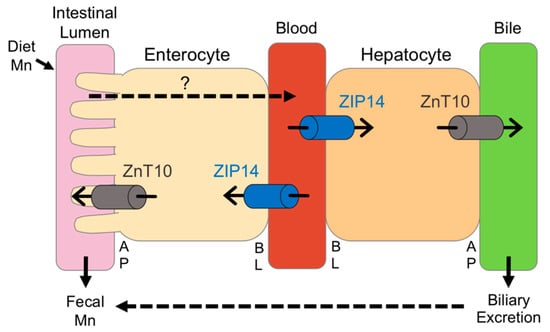 The recommended daily intake of Mn for adults is 2.3 mg/day for men and 1.8 mg/day for women [5]. Although only a small percentage of Mn is absorbed in humans, naturally-occurring Mn deficiency is uncommon as it is found in high levels in whole grains, legumes, rice, and nuts [6]. Mn homeostasis is believed to be largely maintained by hepatobiliary excretion, where absorbed Mn is taken up into the liver and conjugated to bile for excretion through the biliary duct and intestinal tract [7,8,9]. The mechanisms underlying Mn absorption remain unknown, but it is thought that regulation of whole-body Mn homeostasis occurs at least partially at the intestinal absorption level [10].
