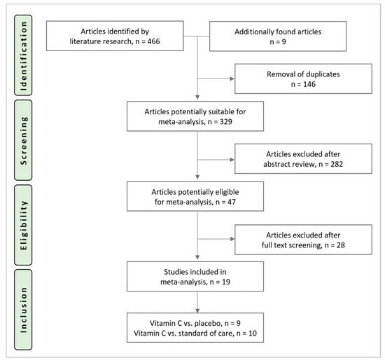 Nineteen RCTs with 2008 patients were included. Their characteristics are described in Table 1. Nine trials including 1422 patients compared vitamin C to a placebo and 10 trials including 932 patients were controlled by standard of care. Eight studies including 724 patients administered the study medication intravenously and six studies including 734 patients administered orally. One study with 290 patients supplemented intravenously before and orally after surgery [19]. In four trials, the mode of administration was not available [20,21,22,23].