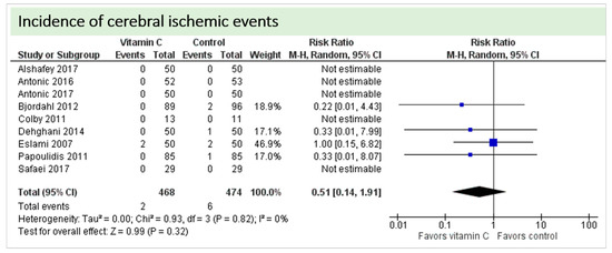 No study reported on postoperative cognitive dysfunction or delirium. Nine studies including 942 patients reported on the occurrence of stroke as shown in Figure 4. In three of these, no stroke occurred in either group, and results were not estimable in meta-analysis. On average, no significant effect of vitamin C on the occurrence of stroke was observed (p = 0.32, confidence interval (CI) 0.14 to 1.91) with a very low overall incidence of stroke (8/942 patients, 0.85%). No statistical heterogeneity was observed (I2 = 0%).