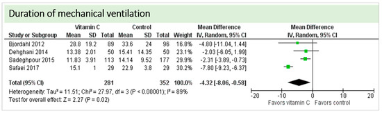 No study reported on the need for non-invasive ventilator support, oxygen requirement or pleural effusions as surrogate parameters of pulmonary function. Four studies including 633 patients reported on ventilation time in hours as shown in Figure 6. Two studies reported results in favor of vitamin C, two studies were neutral. On average, the effect of vitamin C was significant on reduction of ventilation time (p = 0.0003, CI −3.99 to −1.18); we observed no statistical heterogeneity (I2 = 0%). The effect of vitamin C was more pronounced in studies with intravenous administration of vitamin C [19,36].