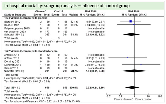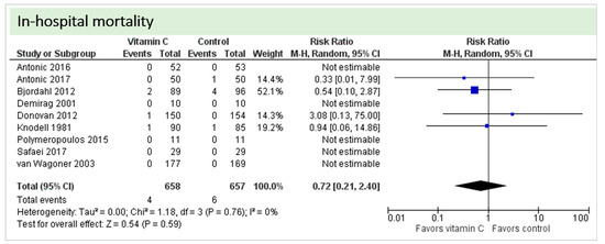 Nine studies including 1315 patients reported on this outcome. In five studies, no deaths occurred, and data could not be estimated. On average, no significant effect of vitamin C was found on in-hospital mortality (p = 0.59, CI 0.21 to 2.40), as shown in Figure 7. One study described two in-hospital deaths but did not specify the groups of the respective patients [24]. No statistical heterogeneity was observed (I2 = 0%).