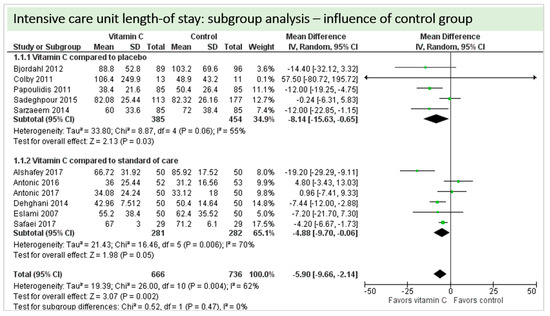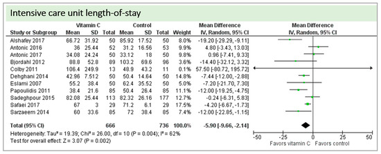Eleven studies including 1402 patients reported on ICU-LOS as shown in Figure 8. One study reported longer overall ICU-LOS than all other RCTs [27]. On average, a significant effect favoring vitamin C administration was detected (p = 0.002, CI −9.66 to −2.14). High statistical heterogeneity was observed (I2 = 62%).