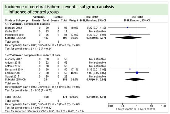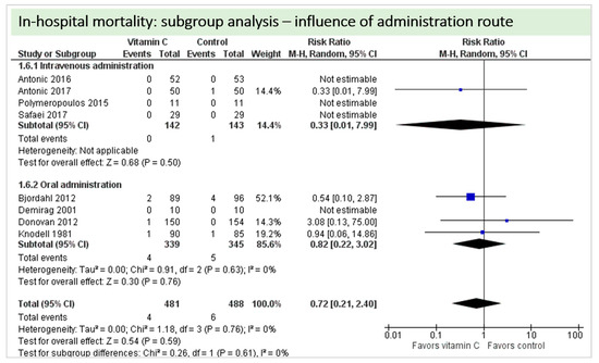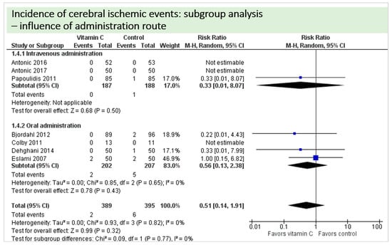 This subgroup analysis was performed to investigate any possible influence of the route of administration (intravenous administration versus oral administration of vitamin C) on study results; available data allowed assessment of the outcomes cerebral ischemic events, incidence of atrial fibrillation, in-hospital mortality, ICU-LOS, hospital-LOS, and duration of mechanical ventilation.