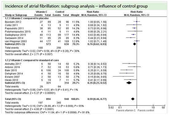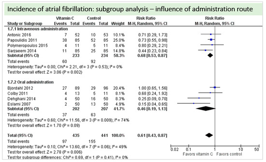 A total of eight studies contributed to the subgroup analysis investigating any possible influence of the route of administration on the outcome incidence of “atrial fibrillation”, as shown in Figure 11. While the effect of the treatment was statistically significant in the group receiving intravenous vitamin C (p = 0.002, CI 0.53 to 0.87, I2 = 0%), it was not in patients receiving oral vitamin C (p = 0.09, CI 0.19 to 1.13, I2 = 74%). However, the test for subgroup differences (Chi2 = 0.69, df = 1 (P = 0.41), I2 = 0%) shows no evidence that the effect of vitamin C is different between the trials that used intravenous administration and those that used oral administration on the outcome incidence of “atrial fibrillation”.
