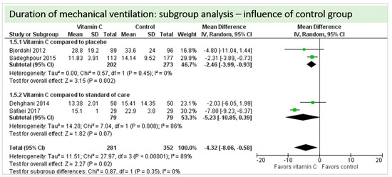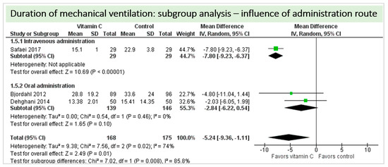 A total of four studies contributed to the subgroup analysis investigating any possible influence of the route of administration on the outcome “duration of mechanical ventilation”, as shown in Figure 12. We found a statistical significance in the group receiving intravenous vitamin C (p = 0.05, CI −15.52 to −0.08, I2 not applicable); however, this group included only one RCT with 58 patients in total. In the group of oral vitamin C administration, the treatment effect did not reach statistical significance (p = 0.10, CI −6.22 to 0.54, I2 = 0%). The test for subgroup differences (Chi2 = 1.89, df = 2 (p = 0.39), I2 = 0%) shows no evidence that the effect of vitamin C is different between the trials that used intravenous administration and those that used oral administration on the outcome incidence of “duration of mechanical ventilation”.