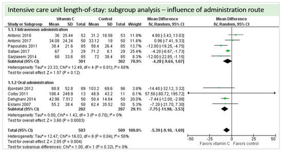 A total of nine studies contributed to the subgroup analysis investigating any possible influence of the route of administration on the outcome “ICU-LOS”, as shown in Figure 14. We found no statistically significant effects in the group receiving intravenous vitamin C (p = 0.12, CI −9.64 to 1.07, I2 = 68%), but in the group of oral vitamin C administration, the treatment effect did reach statistical significance (p = 0.0003, CI −11.98 to −3.53, I2 = 0%). The test for subgroup differences (Chi2 = 1.00, df = 1 (p = 0.32), I2 = 0%) shows no evidence that the effect of vitamin C is different between the trials that used intravenous administration and those that used oral administration on the outcome “ICU-LOS”.