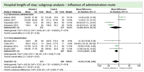 A total of eight studies contributed to the subgroup analysis investigating any possible influence of the route of administration on the outcome “hospital-LOS”, as shown in Figure 15. We found no statistical significance in the group receiving intravenous vitamin C (p = 0.36, CI −45.51 to 16.71, I2 = 91%), but in the group of oral vitamin C administration, the treatment effect did reach statistical significance (p = 0.01, CI −20.07 to −2.36, I2 = 81%). The test for subgroup differences (Chi2 = 0.04, df = 1 (p = 0.85), I2 = 0%) shows no evidence that the effect of vitamin C is different between the trials that used intravenous administration and those that used oral administration on the outcome “hospital-LOS”.
