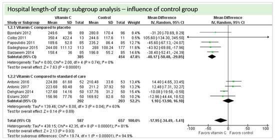 Eight studies including 1244 patients reported on hospital-LOS. The study by Colby et al. [27] reported much longer hospital stays than the other studies. On average, there was a significant effect in favor of vitamin C (p = 0.03, CI −34.49 to −1.41). We observed high statistical heterogeneity (I2 = 81%) (Figure 9).