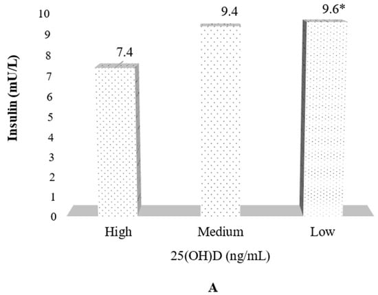 After adjusting for age, sex, BMI, and Tanner stage, with respect to the insulin levels, mean values of 9.6, 9.4, and 7.4 were observed in tertiles low, medium, and high, respectively. Additionally, for the HOMA-IR index, mean values of 2.1, 1.9, and 1.6 were observed in tertiles low, medium, and high, respectively (Figure 1A–C).