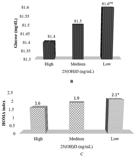 (A–C) HOMA index and related markers 1 by tertile of vitamin D levels. (A) Insulin levels by tertile of serum vitamin D; (B) Glucose levels by tertile of serum vitamin D; (C) HOMA index δ by tertile of serum vitamin D. 1 Values are adjusted by age, sex, BMI, Tanner stage. δ Homeostasis Model Assessment (HOMA index) was calculated as fasting insulin (U/L) × fasting glucose (mg/dL)/405. * p < 0.001; NS: not statistically significant.