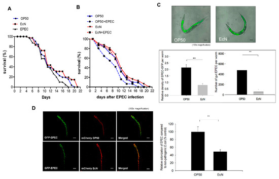 C. elegans Bristol N2 (Brenner 1974) (Caenorhabditis Genetics Center, University of Minnesota, Minneapolis, MN, USA) was maintained at 20–25 °C on nematode growth medium (NGM) agar (50 mM NaCl, 1.7% agar, 0.25% peptone, 1 mM CaCl2, 5 μg/mL of cholesterol, 1 mM MgSO4 and 25 mM KPO4 in dH2O) plates spread with E. coli OP50 (Pohang, South Korea) or EcN as a food source. C. elegans was synchronized with a mixture of 500 μL of 5 M NaOH, 1 mL of 5% solution of sodium hypochlorite (Yuhan-Clorox, Seoul, South Korea), and 3.5 mL of autoclaved dH2O. Synchronized eggs were seeded on the NGM plate for growth while the worms at L4 stage were seeded on a new NGM plate with or without 50 µM 5-fluoro-2′-deoxyuridine (FUdR, Tokyo Chemical Industry, Portland, OR, USA). E. coli OP50 and EcN (OD600 = approximately 0.6–0.8) were spread on this dish. After this, worms were exposed to EPEC (OD600 = approximately 0.6–0.8) for the time indicated. For the lifespan assays in the presence of each bacterium, presynchronized L4 worms were grown on the E. coli OP50, EcN, or EPEC lawn (without tryptophan) for 48 h. For lifespan assays to measure the impact of EcN pretreatment, presynchronized L4 worms were grown on the E. coli OP50 and EcN lawns for 48 h before being grown with EPEC on NGM plates containing tryptophan (2 mg/mL) for 48 h. To prevent the produced offspring from producing progeny, worms were transferred to a new NGM plate every day. The survival of worms was scored every day, which involved determining their ability to move in response to touch with a platinum wire.