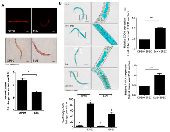 Mechanistically, it is well known that EPEC-induced cytoskeletal rearrangement leads to disruption of the gut epithelial microvilli and barrier [12]. Thus, we investigated the effects of EcN on EPEC-induced collapse of the worm gut barrier by measuring the permeability as the key parameter for evaluating the gut barrier integrity. The measurement of permeability was based on staining using Nile Red and Oil Red O (Figure 2A). As a lipophilic dye, Nile Red was used to measure the fat under the intestinal epithelial layer while Oil Red O was used for counterstaining the major lipid storage region in the nematodes [24,29]. Of note, the treatment with EcN significantly reduced the relative permeability of an EPEC-infected gut compared to the OP50 treatment group (Figure 2A). Moreover, the barrier integrity was tested using a non-absorbable blue food dye, which was visualized microscopically. Although the majority of the dye stains was observed within the intact gut lumen, EPEC-infected worms displayed spreading of the dye into their body cavity (Figure 2B). However, EcN pretreatment partly counteracted EPEC-induced dye spreading to the body cavity, which supports the barrier-protective action of EcN in the worm gut. Since impaired epithelial TJs cause the loss of epithelial cell integrity and disruption of epithelial polarity, we hypothesized that the TJ could be involved in EcN-induced protection against EPEC-induced barrier disruption. In particular, the levels of ZOO-1 (human ZO-1 homologue) and F10A3.1 (human Claudin homologue), which acted as a representative marker of the TJ, was significantly elevated by EcN exposure (Figure 2C), which supports the evidence of protective actions of EcN against EPEC-induced gut barrier disruption. EcN improved the gut barrier integrity of worms by preferentially enhancing the TJ molecules.