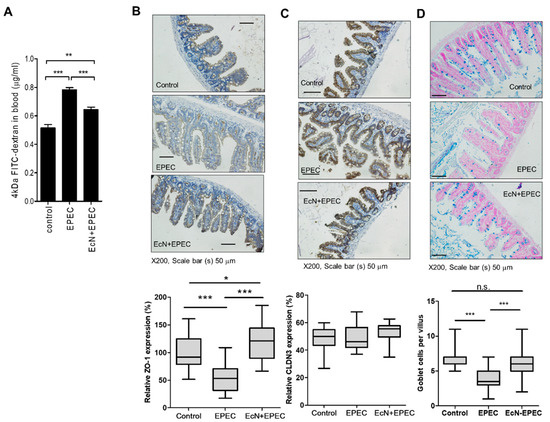 Effect of EcN on gut barrier integrity in EPEC-infected mice. Mice pretreated with EcN (2 × 109 cfu (colony-forming unit) per mouse) were exposed in EPEC-infected mice. (A) Serum FITC-dextran levels. (B,C) Expression of tight junction (TJ) molecules in the colon of mice with colitis. ZO-1 (B) or claudin-3 (C, CLDN3) were analyzed with immunohistochemistry analyses in the colon at day 10 (original magnification ×200; scale bar(s), 50 μm). (D) The sections were stained with Alcian blue for the analysis of goblet cells and mucin production (original magnification ×200; scale bar(s), 50 μm). Lower graphs indicate the quantitation of each staining using the HistoQuest analysis software. Asterisks represent significant differences between the groups (* p < 0.05, ** p < 0.01, *** p < 0.001).