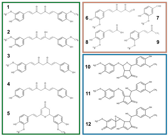 Chemical structures of curcuminoids (green box): (1) Curcumin keto-form, (2) Curcumin enolic-form, (3) demethoxycurcumin, (4) bis-demethoxycurcumin, and (5) cyclo-curcumin. Chemical structures of curcumin degradation products (orange box): (6) trans-6-(4’-hydroxy-3’-methoxyphenyl)-2,4-dioxo-5-hexenal, (7) vanillin, (8) ferulic acid, and (9) feruloyl-methane. Chemical structures of some curcumin autoxidation products (blue box): (10) bicyclopentadione, (11) vinylether, and (12) spiroepoxide.
