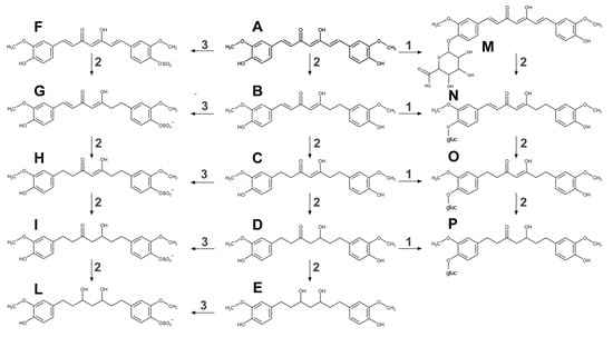Curcumin phase I and II metabolism in a living organism. Curcumin (A) undergoes several reactions of reduction by a reductase (2) to dihydrocurcumin (B), tetrahydrocurcumin (C), hexahydrocurcumin (D) and octahydrocurcumin (E). Curcumin can be both conjugating to any of the hydroxyl groups, with glucuronic acid by glucuronosyltransferase (1) or sulfate by sulfotransferase (3). Phase II products are the followings: curcumin glucuronide (M), dihydrocurcumin glucuronide (N), tetrahydrocurcumin glucuronide (O), hexahydrocurcumin glucuronide (P), curcumin sulfate (F), dihydrocurcumin sulfate (G), tetrahydrocurcumin sulfate (H), hexahydrocurcumin sulfate (I), and octahydrocurcumin sulfate (L). In structure N, O, P ‘gluc’ is referred to as glucuronic acid.