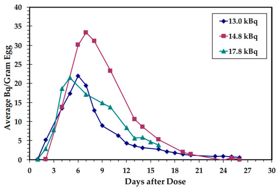 In the Edwards study [23], peak enrichment was noted in eggs produced 5–7 d after dosing when % dose incorporated ranged from 9.6–10.3%. In the present study, the nCi concentration and range of enrichment in peak eggs was similar to that observed by Edwards [23]. Peak enrichment in each injection protocol was achieved in eggs produced on d 6–8 in all hens and ranged from 7.1 to 12.2% of the total dose given (Figure A4). The initial delay in enrichment is due to the time (approximately 24 h) that the egg remains in the ovary, where the B12 is incorporated into the yolk. Each hen incorporated a different percentage of the total dose into the eggs produced over the initial 16-d time period; 48%, 56%, and 39% for doses of 13.0, 14.8, and 17.8 kBq, respectively. The efficiency of B12 incorporation into the eggs enables endogenous 14C-B12 labeling in normal sized servings (Figure 2).