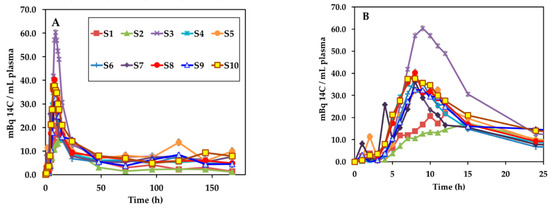 3.2. Appearance of 14C Label in Plasma, Uurine, and Feces