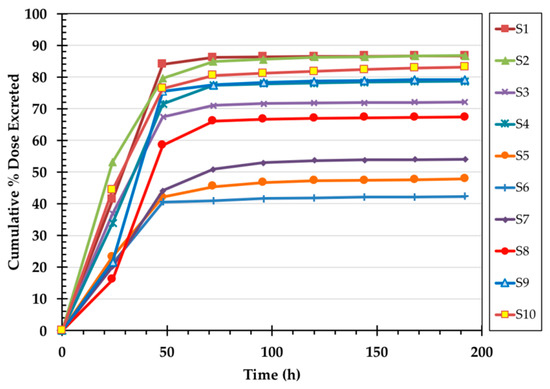 In all volunteers, the majority of 14C label appeared in the first two 24 h urine collections (Figure 4). However, the amount of label recovered in the first 48 h varied widely among the subjects with the cumulative % dose recovered in urine ranging from 5.1 to 62.0% (mean 26.2 ± 18.9%). 14C concentrations in urine returned to near background values by the fifth 24 h urine collection (120 h). The majority of fecal 14C label appeared in the stool by Day 4. However, as with the urine, the amount of label recovered varied widely among the subjects (Figure 5). 14C concentration in stool returned to background concentrations by the fifth 24 h stool collection (120 h). The cumulative % dose recovered in feces ranged from 24.7 to 74.1% with a median 34.2%. The total (urine + stool) excreted 14C ranged from 43.2 to 86.7% with a mean of 69.9 ± 16.4% (Figure 6).