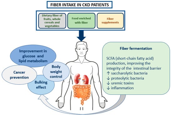 The study of fiber and other dietary components is complex, not only for different proprieties of different kind of fibers. First, it is difficult to assess the dietary fiber intake because no biomarkers are available, and dietary histories are often unreliable. Then, the interaction of fiber with the individual human gastrointestinal tract can change due to previous dietary fiber habits, gut microbiota differences in various individuals, and previous disease or medication [30]. Fiber intake has been investigated as a dietary aspect that may exert a favorable action on renal health through different mechanisms (Figure 1).