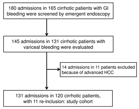 Diagram showing the flow of patients included in the study cohort. In 10 cases of study cohort, variceal bleeding episode occurred during the period of being hospitalized.