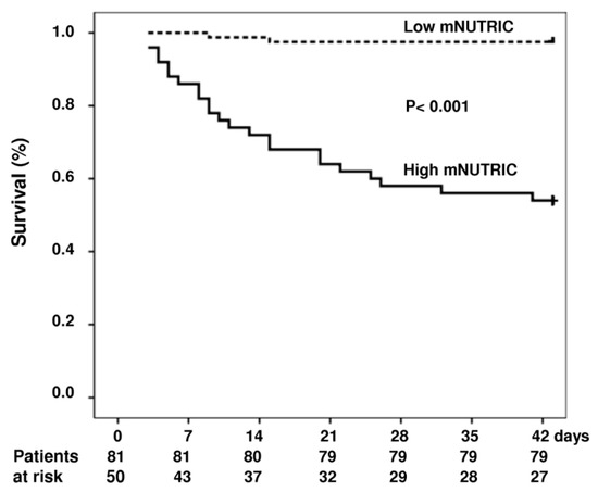 The ICU, 28-day and 6-week mortality rates were significantly higher in high nutrition risk group. Table 3 lists the demographic data, clinical characteristics for both low mNUTRIC and high mNUTRIC groups. Follow-up to 6 weeks or the time of death was complete for the entire groups. The cumulative rates of survival at 6 weeks were 97% and 54% for the low mNUTRIC group and high mNUTRIC group, respectively (p <0.001) (Figure 3).