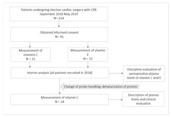 Present findings further question if the perioperative supplementation of vitamins C and E will prevent the decrease of their plasma levels and will increase antioxidant, anti-inflammatory, and immunological defense mechanisms [11,18,20]. In this context, the clinical relevance of the plasma levels of these two antioxidant nutrients need to be evaluated more carefully—not only during the acute perioperative phase, but as well as during the prolonged ICU stay in a larger cohort of higher-risk patients. Importantly, the postoperatively measured higher mean SOFA score in patients with severe vitamin C deficiency and the fact that half the patients were vitamin C deficient prior to surgery raise the question, if a preoperative optimization of these micronutrients would be beneficial for this group of patients undergoing elective and scheduled cardiac surgery.